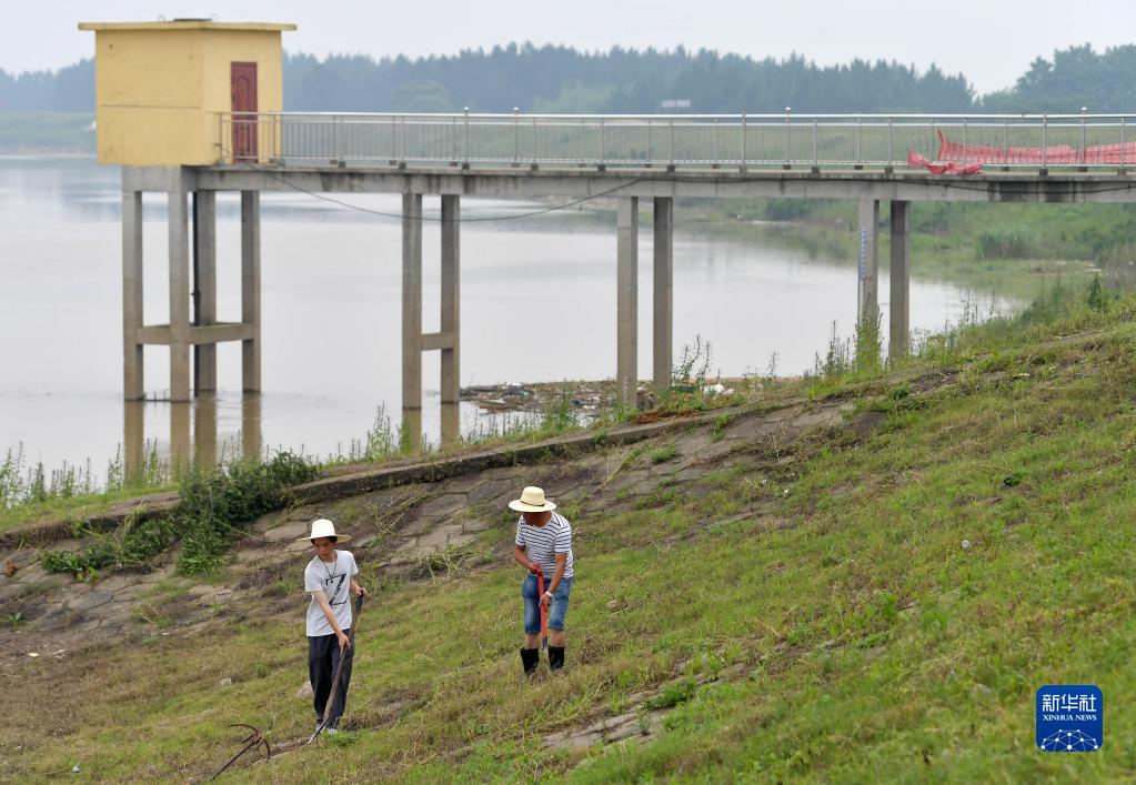 陈申桃(左)和儿子在江西省九江市新港镇东升堤附近处理一起泡泉险情(2020年7月18日摄)。新华社记者 胡晨欢摄