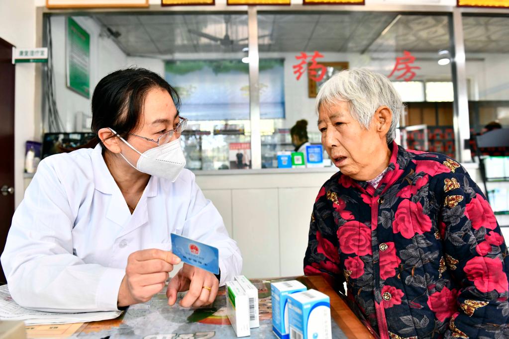 2020年11月11日,在潍坊市寒亭区寒亭街道东院社区卫生室,医生王红霞为村民介绍医保服务下沉政策。新华社记者郭绪雷 摄