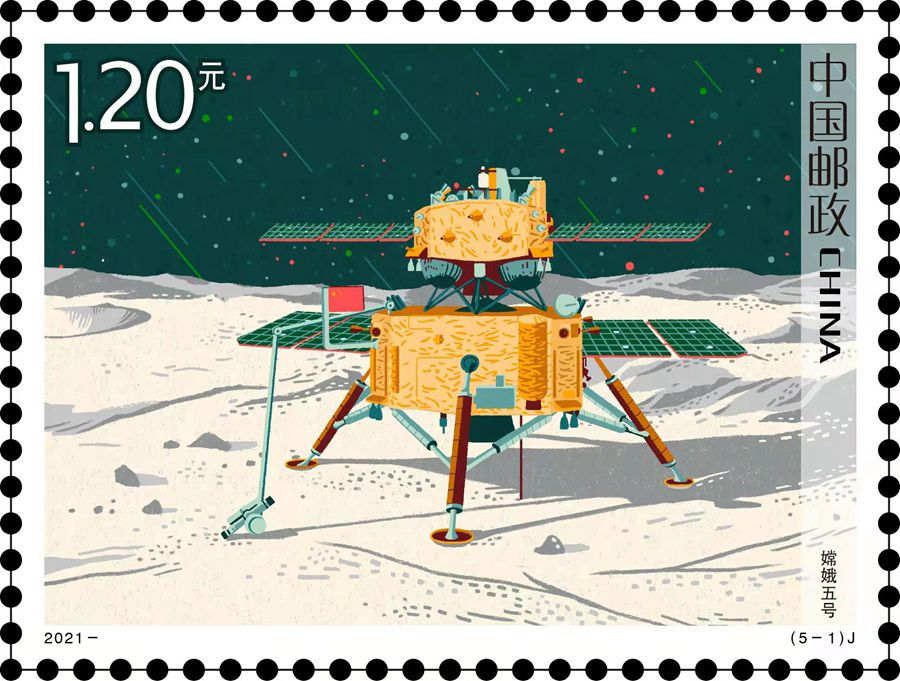 邮票“嫦娥五号”表现了“嫦娥五号”月球探测器首次实施无人月面取样的工作场景。作为我国复杂度最高、技术跨度最大的航天系统工程,嫦娥五号任务实现了我国首次月面采样与封装、月面起飞、月球轨道交会对接、携带样品再入返回等多项重大突破,其成功实施标志着我国探月工程“绕、落、回”三步走规划如期完成。