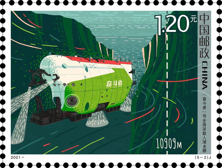 邮票“奋斗者”号载人潜水器以我国首台具备全球海域载人进入能力的重要装备“奋斗者”号为主画面,2020年11月10日,奋斗者号在马里亚纳海沟成功坐底,坐底深度10909米,刷新中国载人深潜的新纪录,标志着我国在大深度载人深潜领域达到世界领先水平。