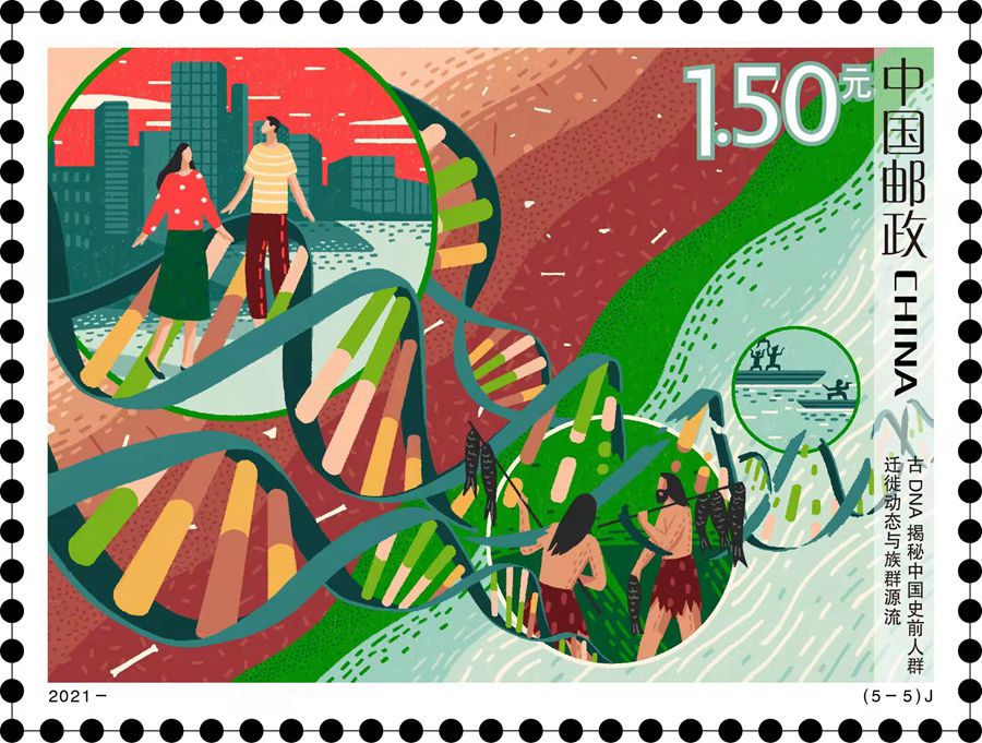 邮票“古DNA揭秘中国史前人群迁徙动态与族群源流”以古今对比、DNA链、古地层等为表现元素,相关研究将中国史前人群遗传与演变历史直接呈现出来,填补了东方尤其是中国地区史前人类遗传、演化、适应方面的重要信息。