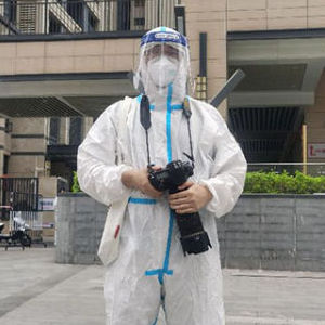 ↑2021年6月12日,新华社记者邓华身穿防护服在采访时的工作照。