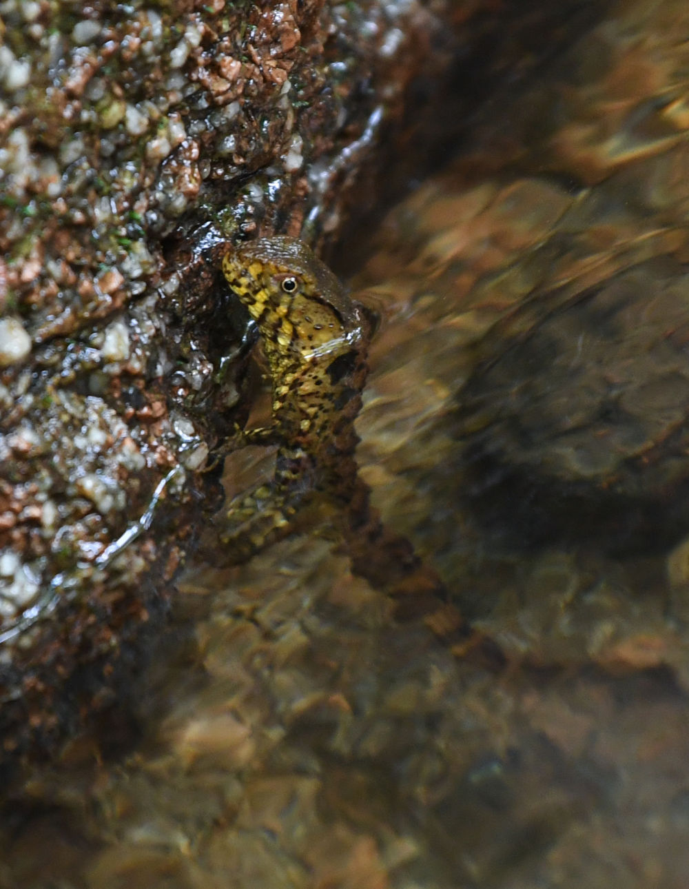 沿着隐藏在深山密林中一条叫作“庙背冲”的小溪沟上行三四百米,在科研人员的指引下,我们幸运地见到了两只野生鳄蜥,其中一只还是去年出生的亚成体。