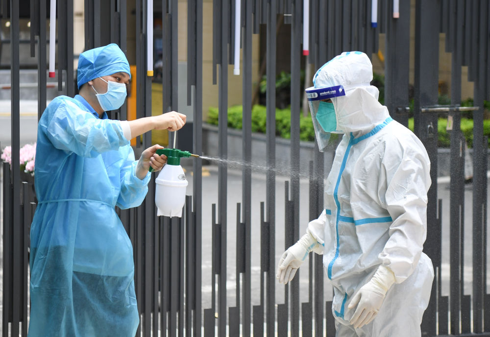 ↑2021年5月27日,在广州荔湾区白鹤洞街道一小区检测点,荔湾区骨伤科医院的医护人员给换班下来的同事喷洒消毒液。