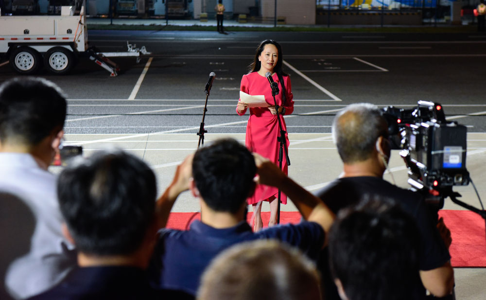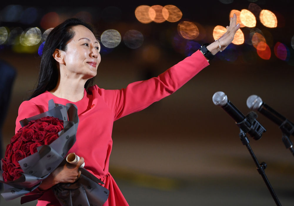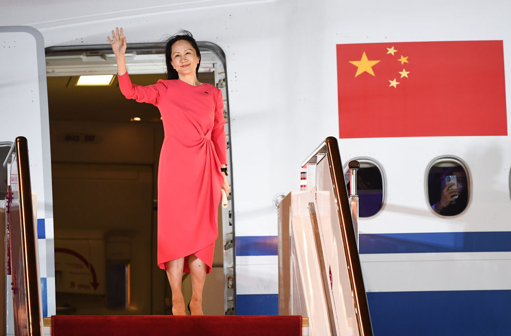 ↑2021年9月25日晚,在党和人民亲切关怀和坚定支持下,孟晚舟在结束被加拿大方面近3年的非法拘押后,乘坐中国政府包机抵达深圳宝安国际机场,顺利回到祖国。
