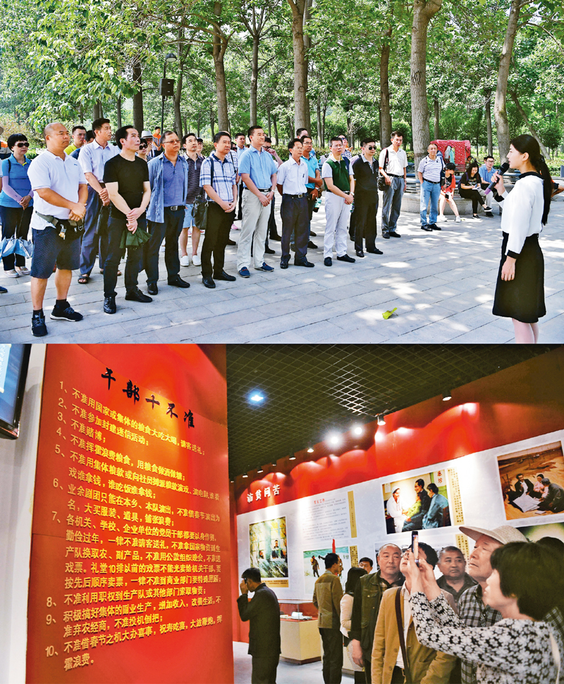 1966年2月,长篇通讯《县委书记的榜样——焦裕禄》播发,焦裕禄的名字传遍千家万户,成为共产党人的光辉典范和全体党员干部崇敬的榜样。党的十八大以来,习近平总书记多次勉励广大党员干部学习弘扬焦裕禄精神,做焦裕禄式的好干部。上图为2017年8月9日,党员干部在焦裕禄干部学院聆听焦桐的故事(新华社记者 冯大鹏/摄);下图为2014年5月5日,干部群众在焦裕禄同志纪念馆观看“干部十不准”展板(新华社记者 朱祥/摄)。