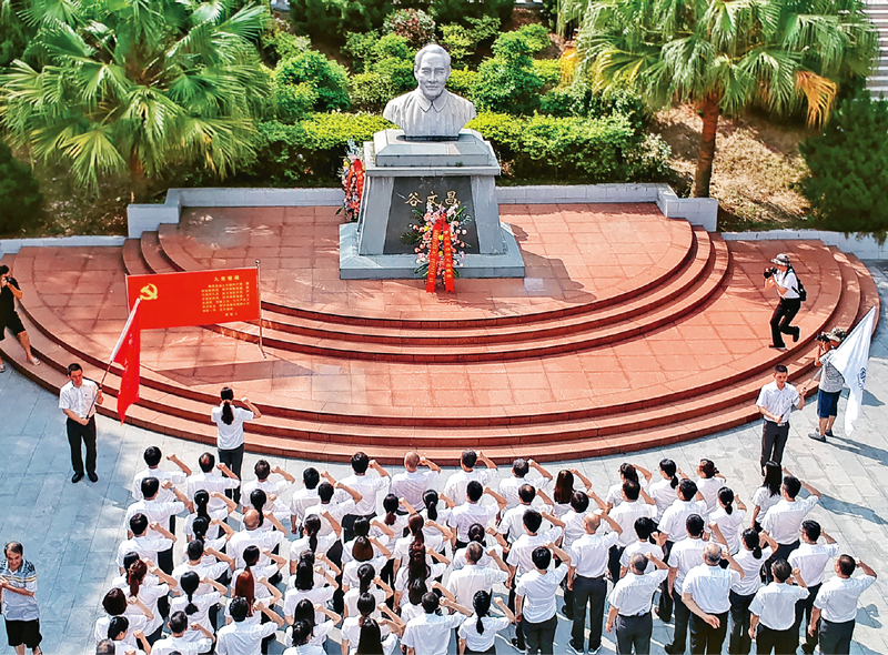 谷文昌在福建省东山县工作14年间,带领东山人民与风灾、旱灾抗争,植树造林,兴修水利,改善交通,发展生产,把一个风沙肆虐的荒岛变成生机盎然的东海绿洲,为经济建设和社会发展奠定了坚实基础。习近平总书记多次提到谷文昌,称赞他“在老百姓心中树起了一座不朽的丰碑”。图为2019年7月1日,党员干部在谷文昌塑像前重温入党誓词。 东山县委宣传部供图 许照临/摄