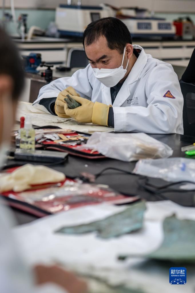在云南省博物馆,青铜文物保护修复师赵国刚对青铜器进行本体保护修复(5月10日摄)。新华社记者 胡超 摄