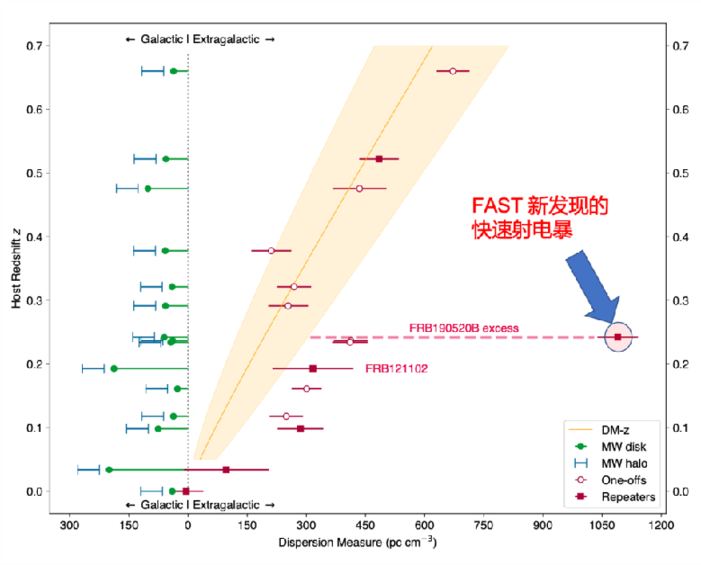 从色散-红移关系上清晰可见FRB 20190520B拥有最大的宿主星系电子密度。中科院国家天文台供图