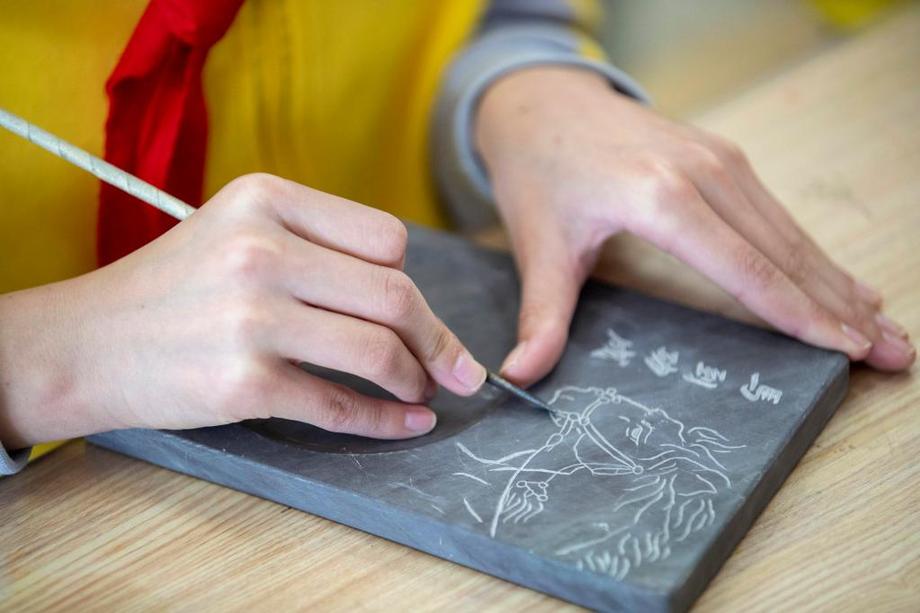 在黄岗小学,一名学生在雕刻端砚。 曹笑 摄