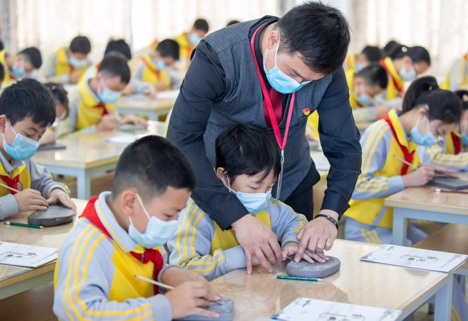 在位于广东省肇庆市端州区白石村的黄岗小学,老师指导学生雕刻端砚。 曹笑 摄