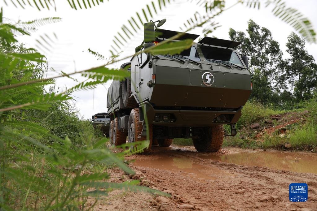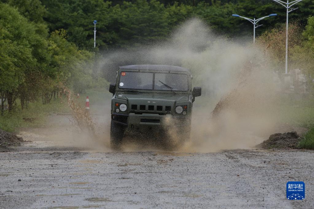 在备战“国际军事比赛-2021”训练中,联勤保障部队某汽车团的一辆指挥车通过障碍路(2021年7月21日摄)。新华社发(万韧 摄)