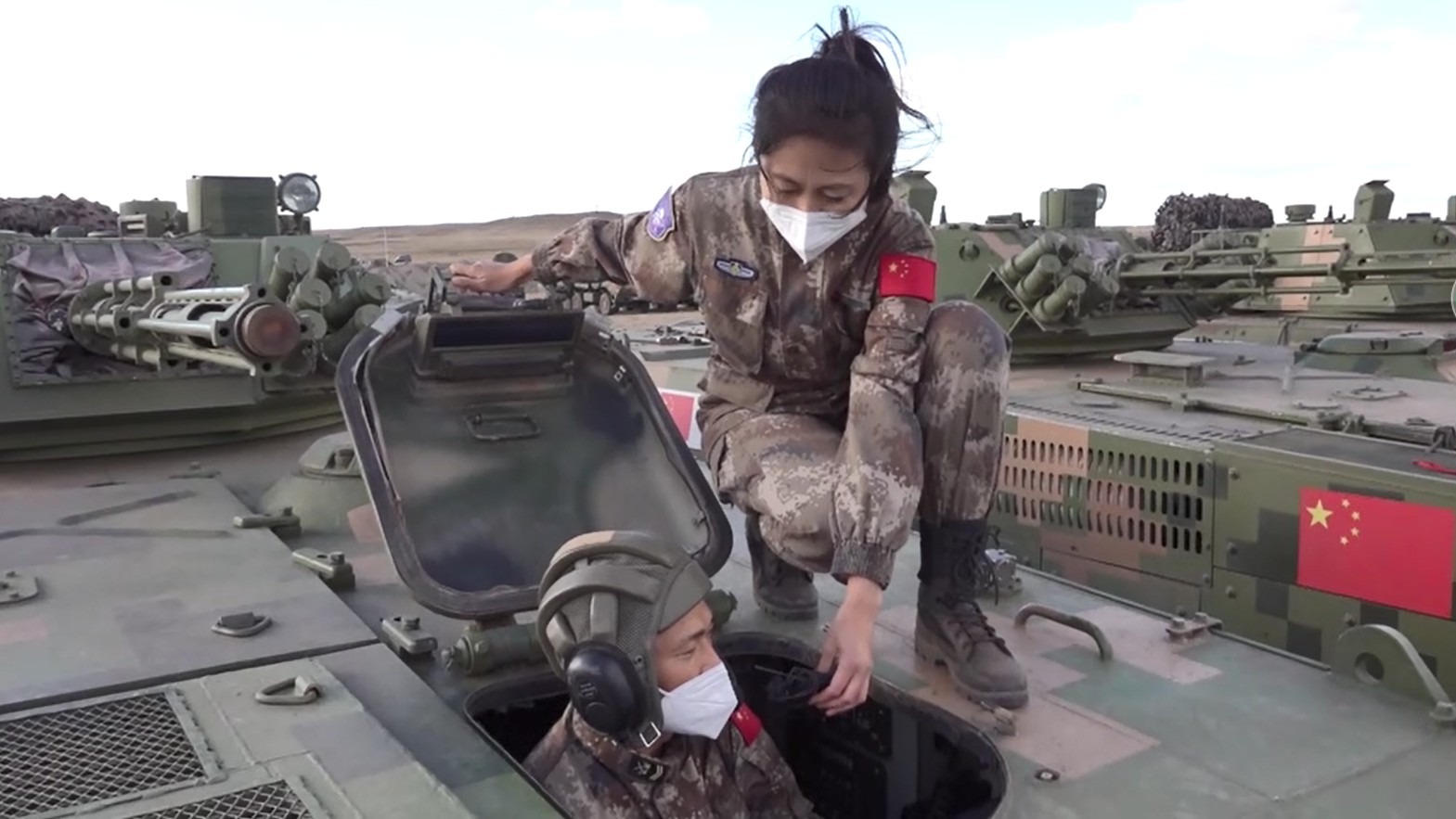 解放军新闻传播中心王琢舒在某演习活动中登上步兵战车采访