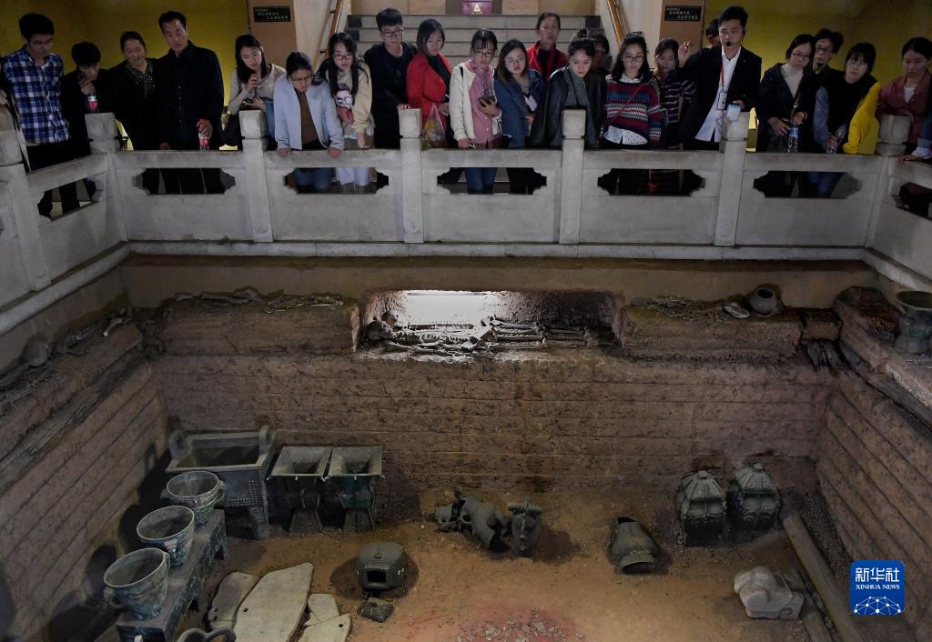 游客在河南安阳殷墟宫殿宗庙遗址内的妇好墓参观(2018年10月12日摄)。 新华社记者 李安 摄