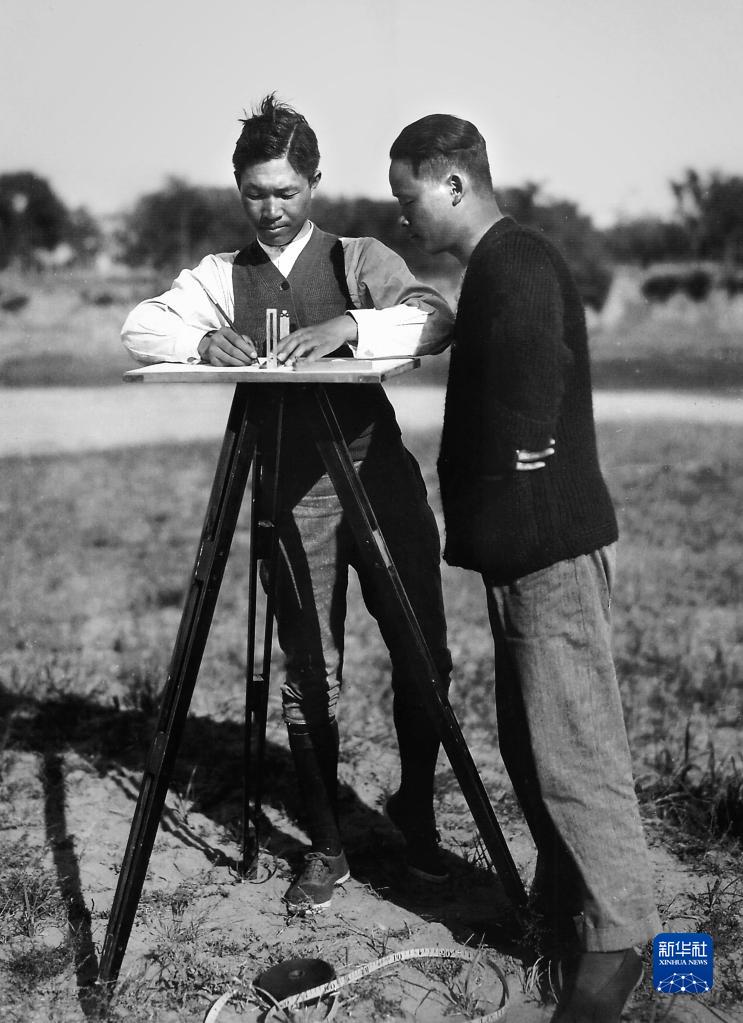 董作宾(右)和李春昱在殷墟第一次发掘中测量绘图(资料照片)。 新华社发