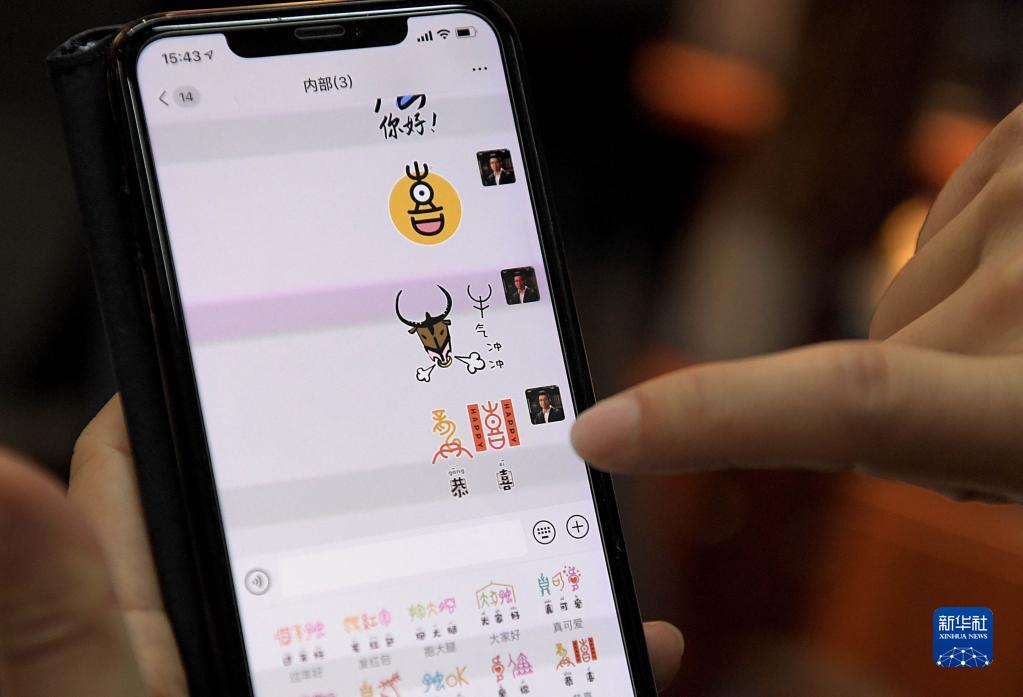 清华大学美术学院教授陈楠在位于清华大学的工作室内展示他设计发布的甲骨文表情包(2019年9月24日摄)。 新华社记者 李安 摄