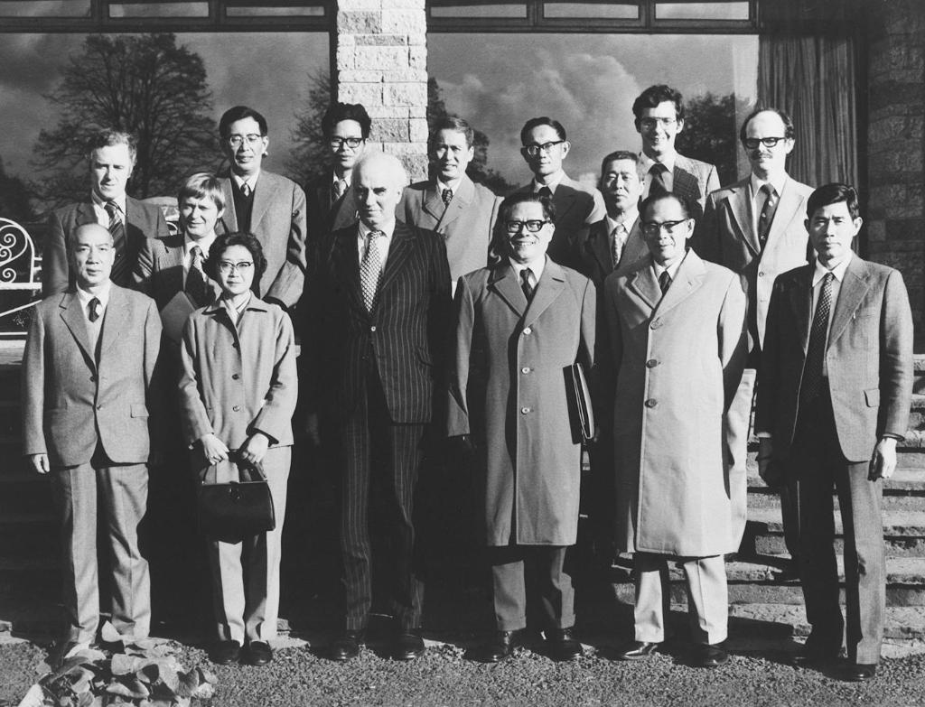 1980年10月底,江泽民同志(前排右三)在爱尔兰香农开发区考察时同开发区负责人等合影。新华社发