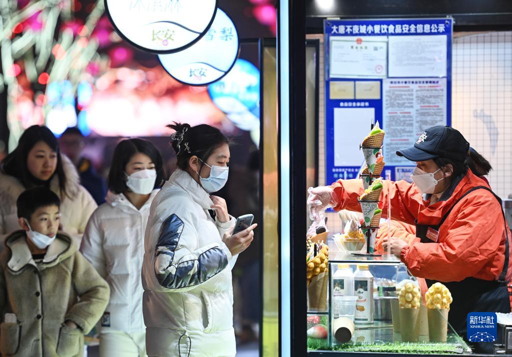2022年12月30日,游客在陕西西安大唐不夜城步行街选购小吃。新华社发(邹竞一 摄)