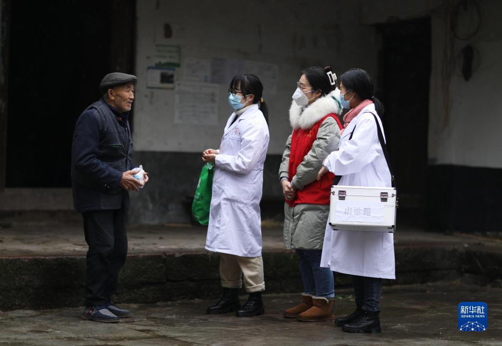 2022年12月28日,在贵州赤水市石堡乡兴农村,医护人员和党员志愿者为村民提供送药上门服务。新华社发(王长育摄)