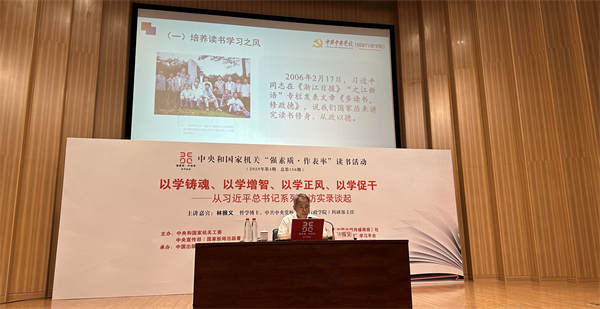 为推动中央和国家机关在学习贯彻习近平新时代中国特色社会主义思想主题教育中走在前、作表率,6月10日,中央和国家机关“强素质·作表率”读书活动2023年第4期在京举办。哲学博士、中央党校(国家行政学院)科研部主任林振义以《以学铸魂 以学增智 以学正风 以学促干——从习近平总书记系列采访实录谈起》为题作主题讲座。中央和国家机关各部门党员干部300余人参加活动,现场气氛热烈,座无虚席。