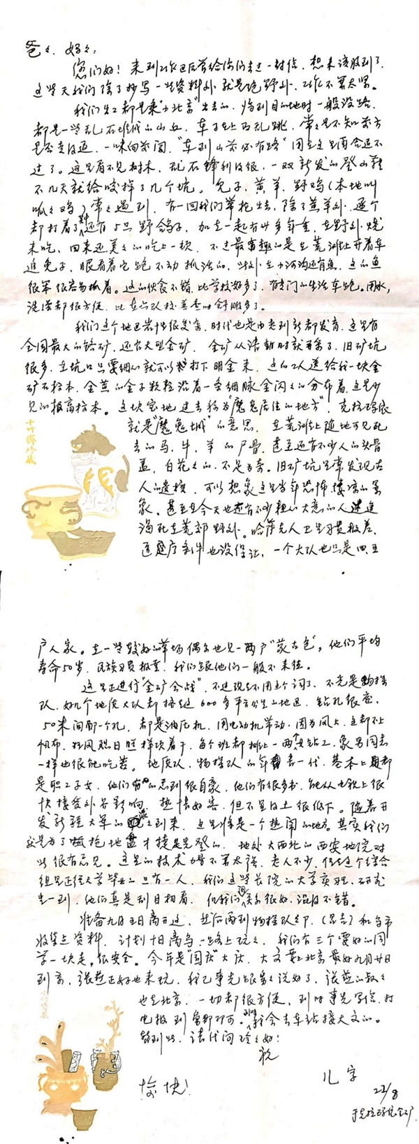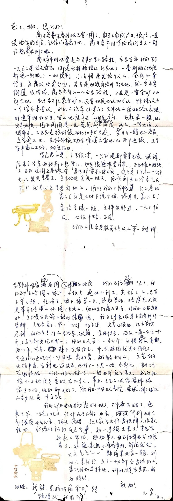 您们好!离开乌鲁木齐到这已有一周了,由于工作刚展开,很忙,一直没给你们去信,让你们着急了吧。工区是一金矿石山所在地,这里不但有矿工,还有地质七队四分队,物探队的一个综合考查队。我们的汽车在平坦的柏油路上疾驶,时速平均90公里,有的地段高达120公里/小时,飞起来一般。因为周围是一片荒芜的准噶尔盆地大沙漠、沙丘,一望无际,人烟稀少。工区在克拉玛依西北60多公里处,要出去一趟也不容易。我们计划9月初离开此地,不准备飞回去了,想乘火车,估计九月下旬到北京。计划九月下旬张燕也去北京,碰头结婚,她在家里正忙着指挥人做家具,我没时间顾及这些事,她一手揽过来了。当然有她家人帮忙,她弟弟已经毕业分回长春了。她说家具不准备多打,够用就行。