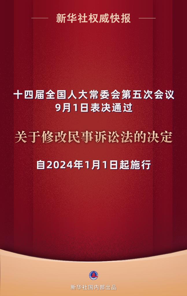 9月1日,十四届全国人大常委会第五次会议表决通过关于修改民事诉讼法的决定,自2024年1月1日起施行。