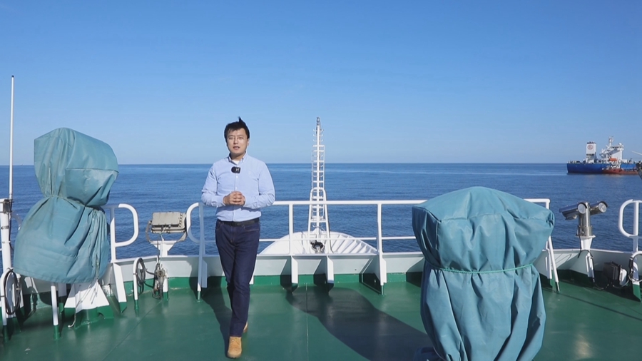 这是去年10月我登上“国信1号”采访时拍的VLOG。当天凌晨三点,我从家中出发,来到崂山沙子口码头,搭乘向阳红52号科学考察船,探访全球首艘10万吨级智慧渔业大型养殖工船“国信1号”,经过7个多小时的航行,我们来到了千里岩以东的黄海海域,这艘庞大的“渔业航母”正在黄海海域进行游弋式“船载舱养”,这就好比给大黄鱼搭建了一艘移动的海上“邮轮”。这艘“邮轮”足足有249米长,相当于两个足球场的长度,我们的科考船靠泊在“国信1号”旁,就好像是在公交车旁停了一辆自行车。