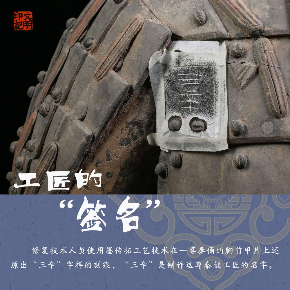 “这件陶俑在修复时,我们在他的右胸前发现了不易察觉的刻划痕迹,通过使用拓片技法还原出是‘三辛’两个字,刻字指明了制作这件陶俑的工匠名”,兰德省指着一旁的秦俑说到。这样的意外惊喜,令文物工作者如数家珍。