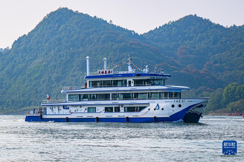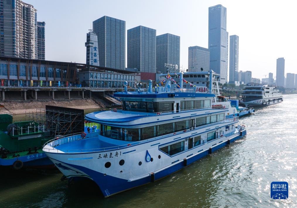 10月11日,启航前的“三峡氢舟1”号停靠在湖北宜昌三峡游客中心(无人机照片)。新华社记者 肖艺九 摄