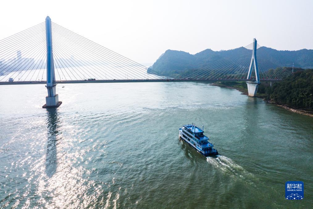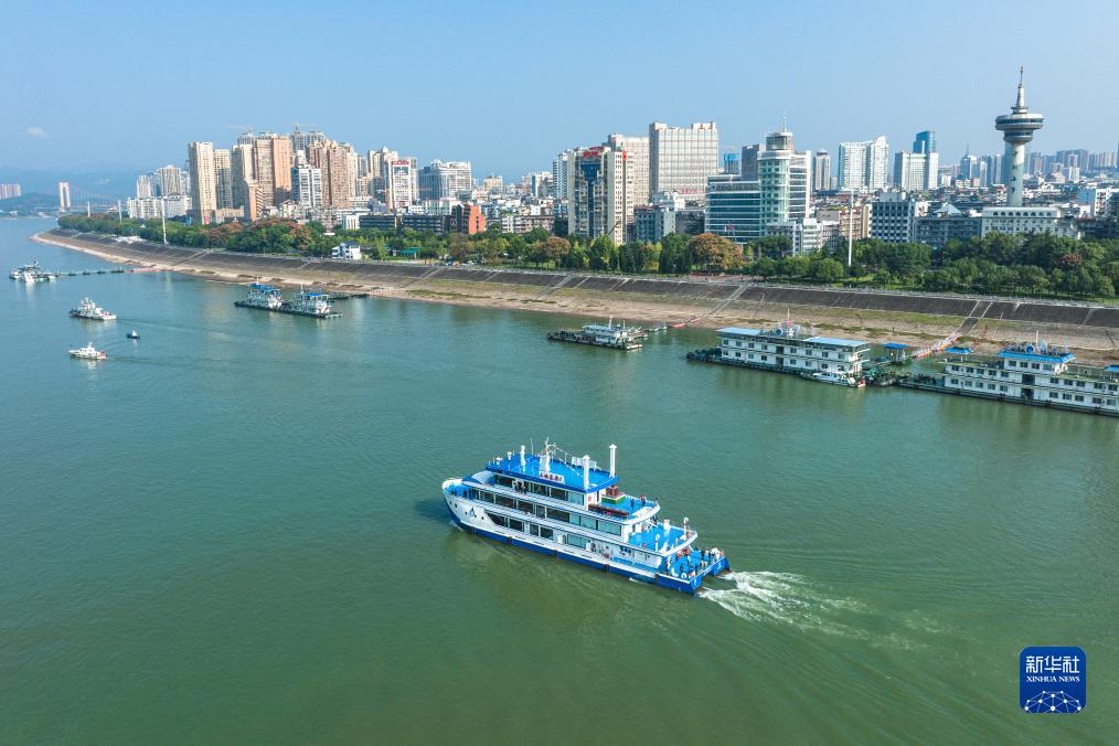 10月11日,“三峡氢舟1”号行驶在长江湖北宜昌水域(无人机照片)。新华社记者 肖艺九 摄