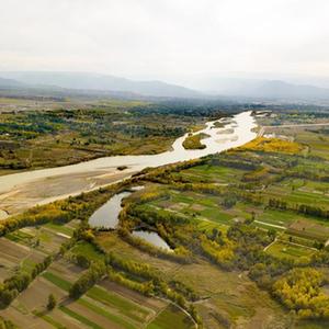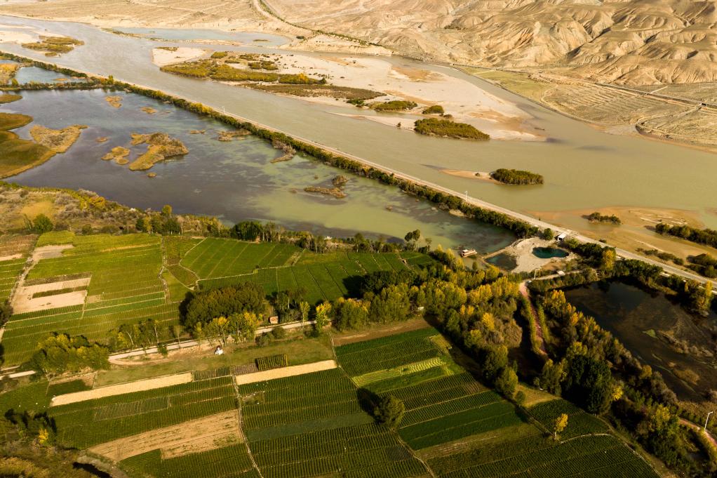 金秋时节,黄河上游的青海省海南藏族自治州贵德县黄河两岸层林尽染,秋色迷人,清澈的河水与周围景物、村庄相互映衬,勾勒出奇美壮丽的黄河画卷。
