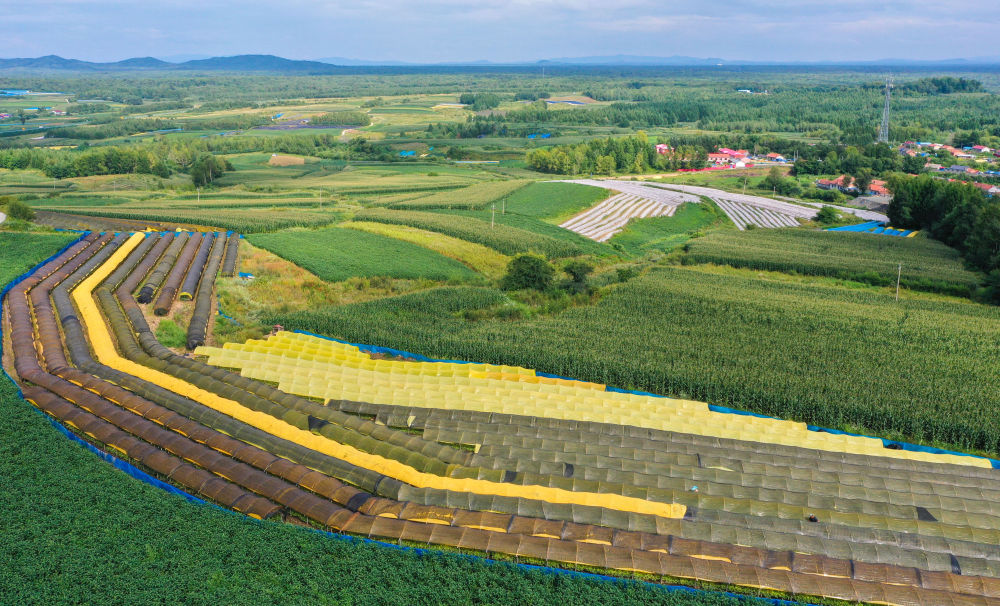 这是2020年8月28日在吉林省抚松县万良镇大方村旁拍摄的人参种植大棚(无人机照片)。新华社记者 许畅 摄