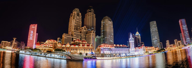 9月23日,天津市津湾广场海河夜景(6张照片拼接)。新华网 钟奕 摄