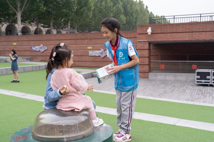 9月27日,来自天津市和平区新华南路小学的小志愿者们在五大道文化旅游区向游客宣传“争做文明有礼天津人”。新华网 钟奕 摄