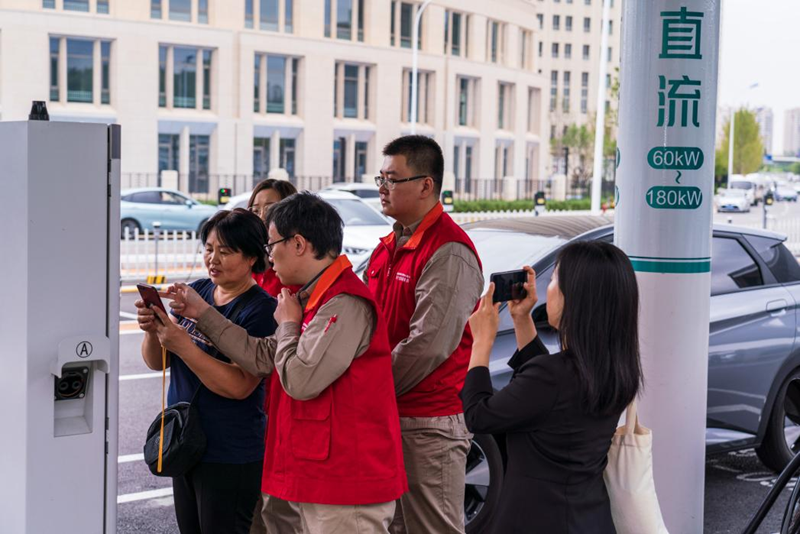 9月24日,国家电网天津滨海供电分公司于家堡双碳创新充电站的志愿者正在帮助车主使用手机支付充电费用。新华网 钟奕 摄
