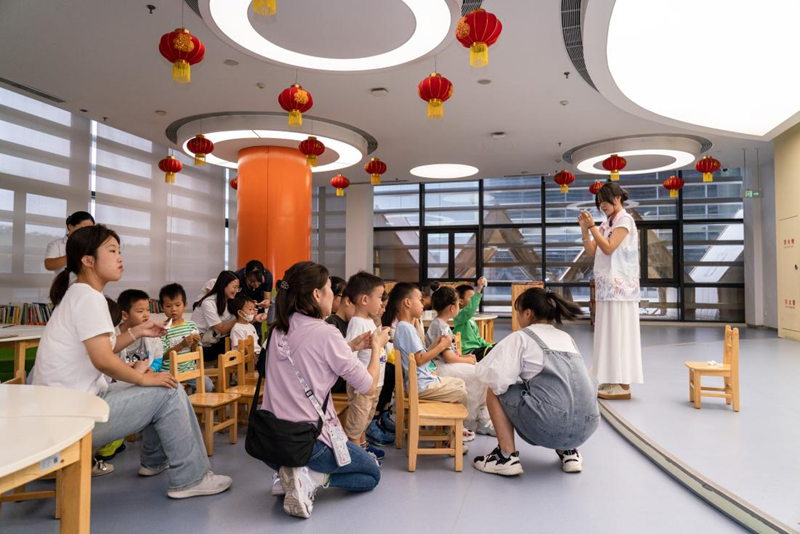 9月24日,天津市滨海新区图书馆里的志愿者正在带领儿童学习折纸,通过公益服务活动吸引小读者,播撒学习的种子。新华网 钟奕 摄