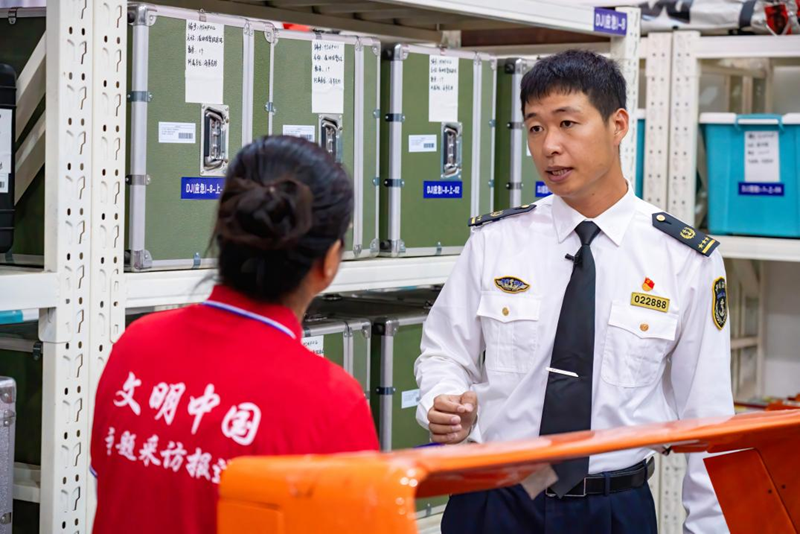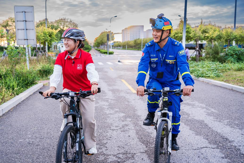 9月24日,“文明中国”主题采访报道组在天津市滨海新区开展骑行采访活动。图为记者(左)在骑行采访活动当中,参观中国海事天津东疆溢油应急设备库。新华网 钟奕 摄