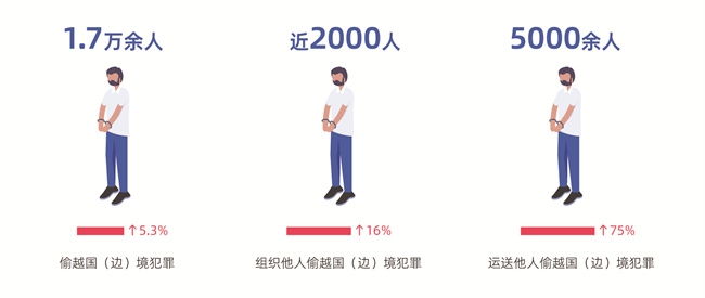 4.起诉妨害国(边)境管理犯罪数量快速上涨,成为电信网络诈骗犯罪链条上的多发罪名。当前,随着境内打击力度加大,电信网络诈骗犯罪集团大量向境外转移,且有组织地招募、吸收境内人员通过偷越国(边)境的方式赴境外参与实施犯罪。2023年1月至10月,全国检察机关共起诉偷越国(边)境犯罪1.7万余人,同比上升5.3%;起诉组织他人偷越国(边)境犯罪近2000人,同比上升近16%;起诉运送他人偷越国(边)境犯罪5000余人,同比上升近75%。