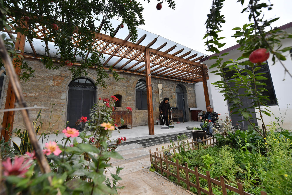 ↑村民在石家庄市鹿泉区岸下村一处民宿小院收拾家务(10月12日摄)。