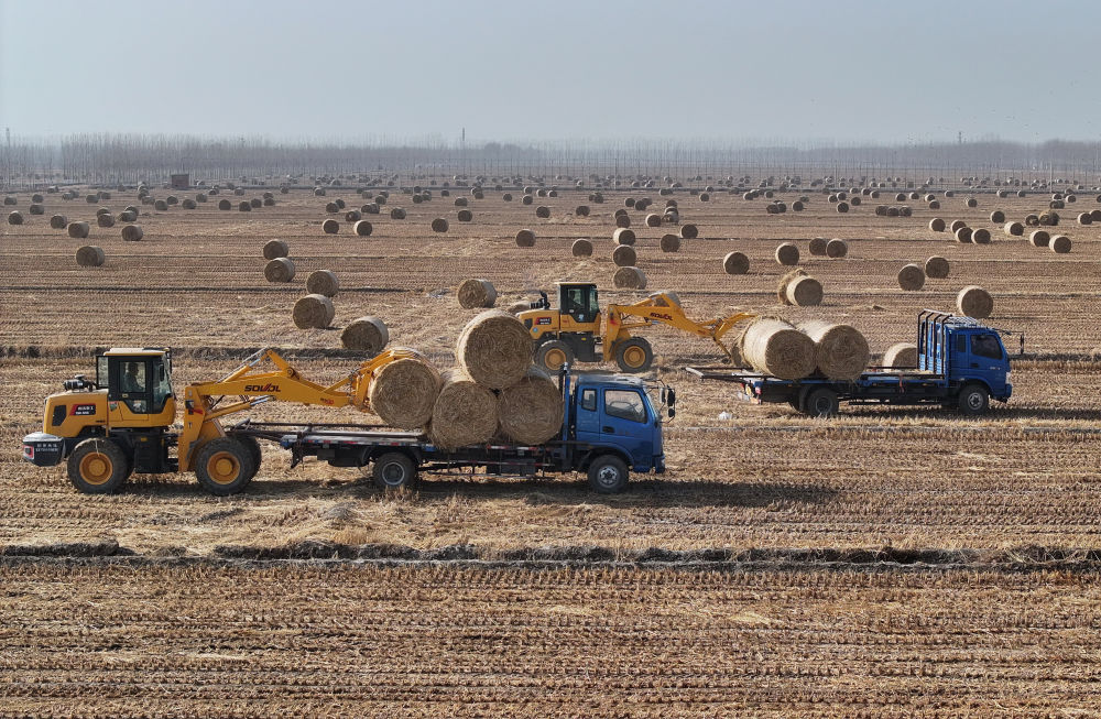 ↑河北省唐山市曹妃甸区第八农场田间,稻草回收企业的工人将打好捆的稻草装车(无人机照片,12月10日摄)。曹妃甸区通过将稻草集中收集用于生物质发电、牲畜饲料和有机肥生产,有效提高了秸秆综合利用率。