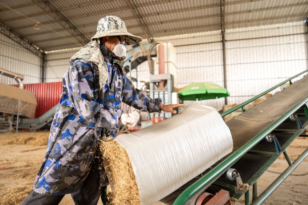 ↑湖南省益阳市南县武圣宫镇沿河堤村,工人把打捆好的秸秆放置在传送带上(11月25日摄)。