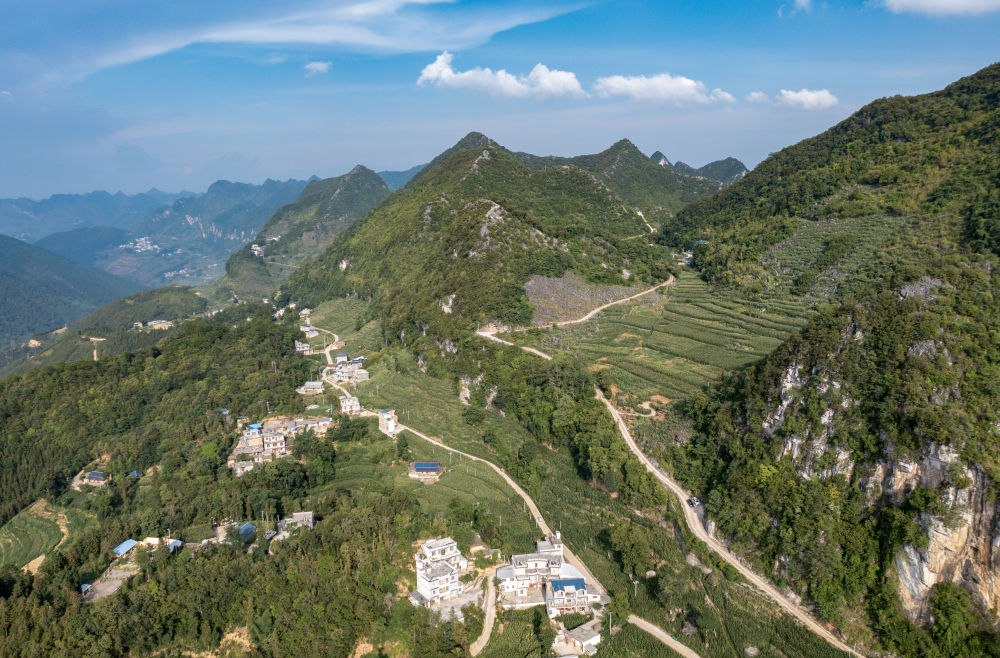↑云南省文山壮族苗族自治州西畴县山间公路,右侧这条是岩头村村民小组长李华明带领群众修建的最后一公里进村道路(无人机照片,7月26日摄)。