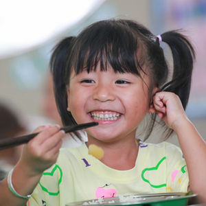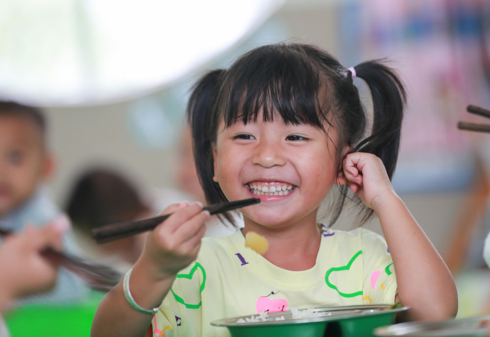 ↑贵州省从江县刚边壮族乡中心幼儿园的小朋友在享用免费营养午餐(9月15日摄)。