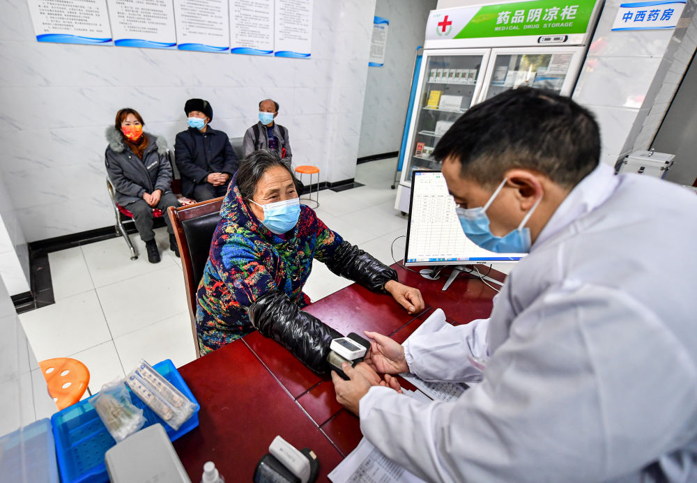 ↑四川省绵阳市北川县曲山镇任家坪村、石椅村联合卫生室村医赵太安(右一)在村卫生室为前来问诊的村民测量血压(1月19日摄)。
