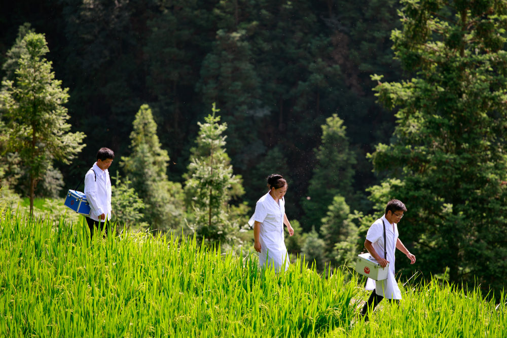 ↑贵州省黔东南苗族侗族自治州榕江县忠诚镇,村医吴昌喜(左)、吴涛(右)、项昌会走在榕江县忠诚镇定弄村郊外的田埂上(8月16日摄)。吴昌喜和儿子吴涛、儿媳项昌会都是村医,呵护着三个村820多户、3660多名群众的健康。