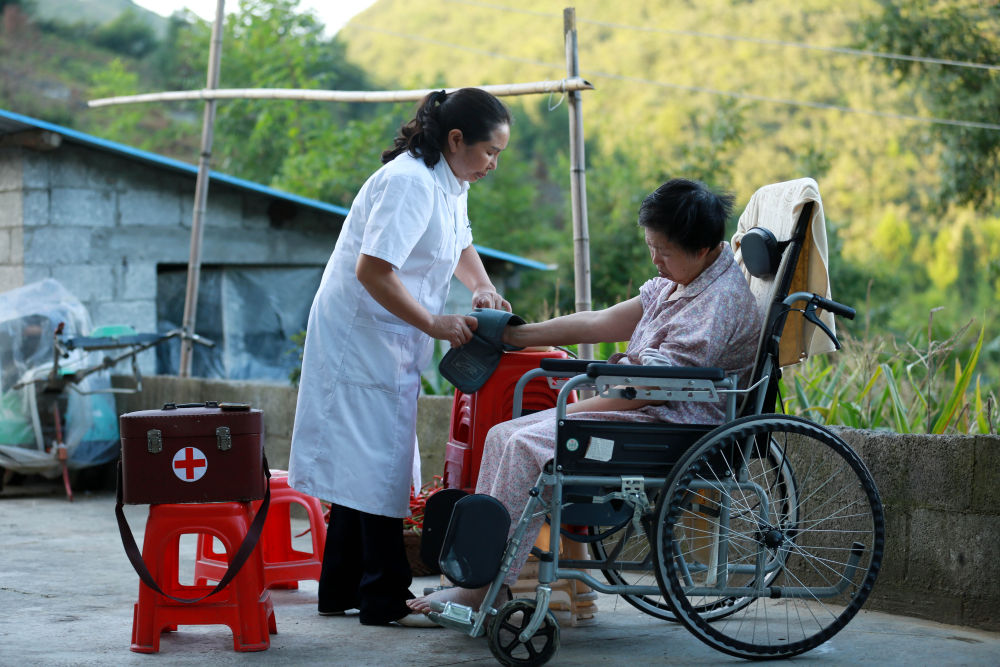 ↑贵州省黔南布依族苗族自治州贵定县云雾镇摆谷村,村医罗海香(左)为一名行动不便的村民测量血压(8月16日摄)。