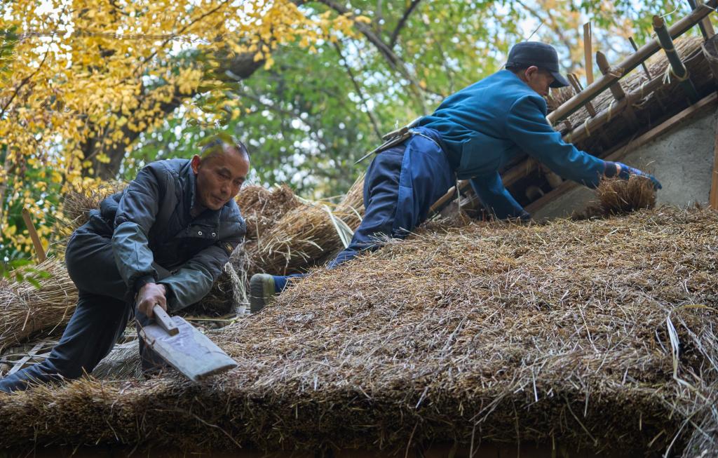 12月19日,在成都杜甫草堂茅屋故居,盖匠师傅用木梳板压实新铺的茅草。新华社记者 薛晨 摄