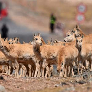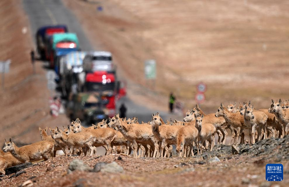 一群待产雌性藏羚羊正在通过青藏公路前往可可西里卓乃湖产仔(2023年5月29日摄)。新华社记者 张宏祥 摄