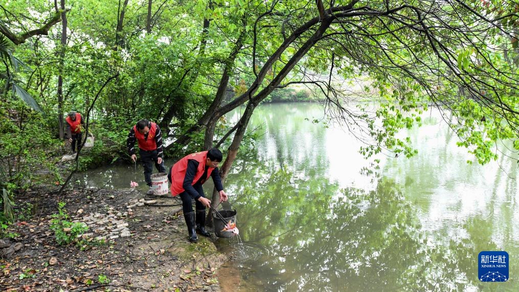 在湖南省常宁市三角塘镇,河道保洁员在沙水河边捡拾垃圾(2023年4月5日摄)。新华社发(周秀鱼春 摄)