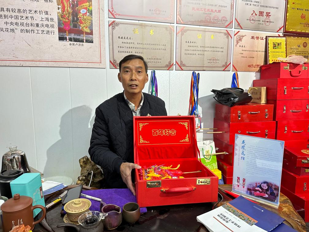 陈建友向记者展示龙凤花烛。新华社记者刘梓桐 摄